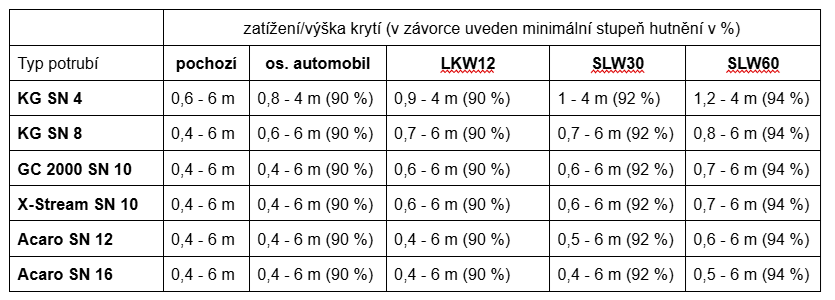 Hloubka uložení pro jednotlivé typy potrubí se obecně řídí tabulkou níže.