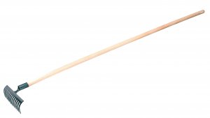 Standardní kovové hrábě s dřevěnou násadou vhodné pro sklízení menšího stavebního materiálu.