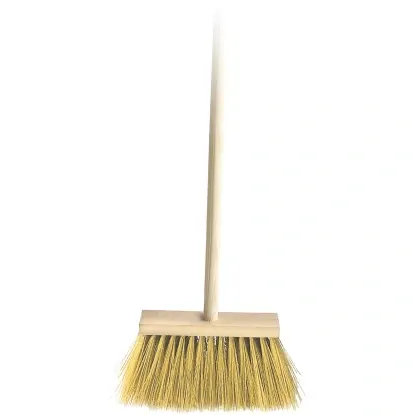 Standardní stavební koště s hrubým vlasem a dřevěnou násadou, které použijete při jakékoliv úklidové práci.