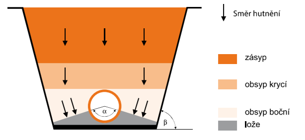 Obsyp stabilizuje potrubí a přenáší zatížení do okolní zeminy. Provádí se rovnoměrně po obou stranách a nad potrubím. V blízkosti trubky se hutní ušlapáním.