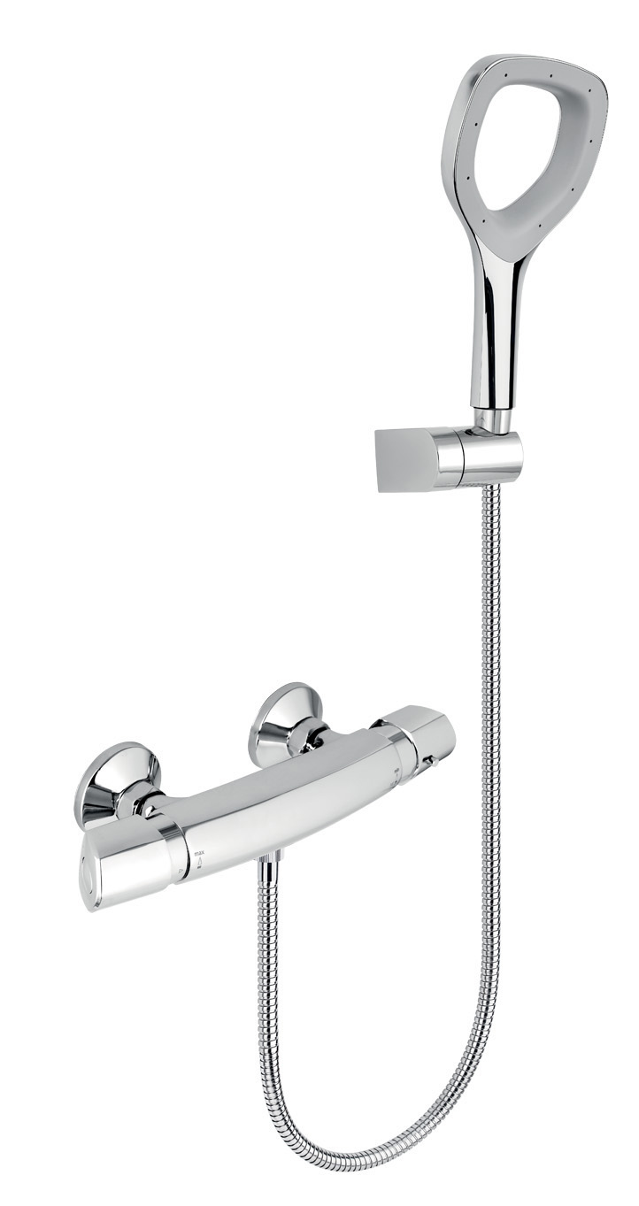 Sprchová nástěnná baterie s terostatickou kartuší, spodním vývodem a roztečí 150 mm.